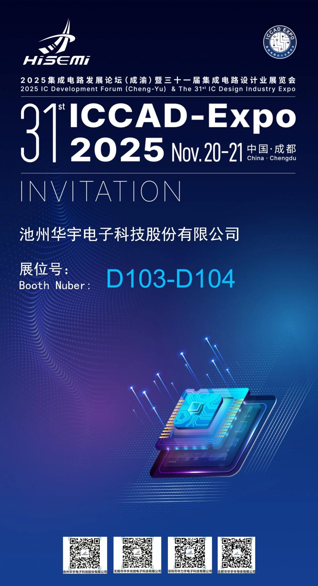 邀請函 | ICCAD 2025即將啟幕,華宇電子邀您共赴成都之約 2026-01-12 2025集成電路發展論壇(成都)暨第三十一屆集成電路設計業展覽會(ICCAD-Expo 2025)將于11月20-21日在成都西部國際博覽城二層隆重舉行。 屆時 閱讀更多?