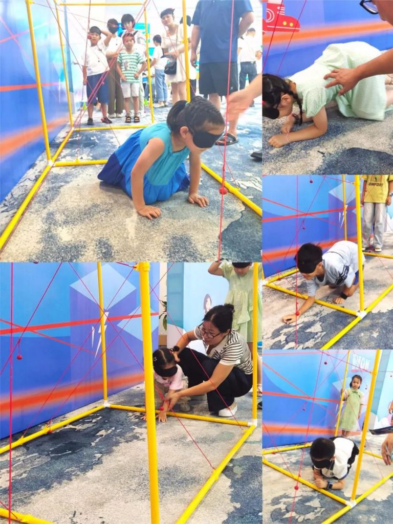 游戲規則:家庭成員兩人參與挑戰,一人戴眼罩參與挑戰,另一人道具外指揮,不觸碰網線通過即挑戰成功。