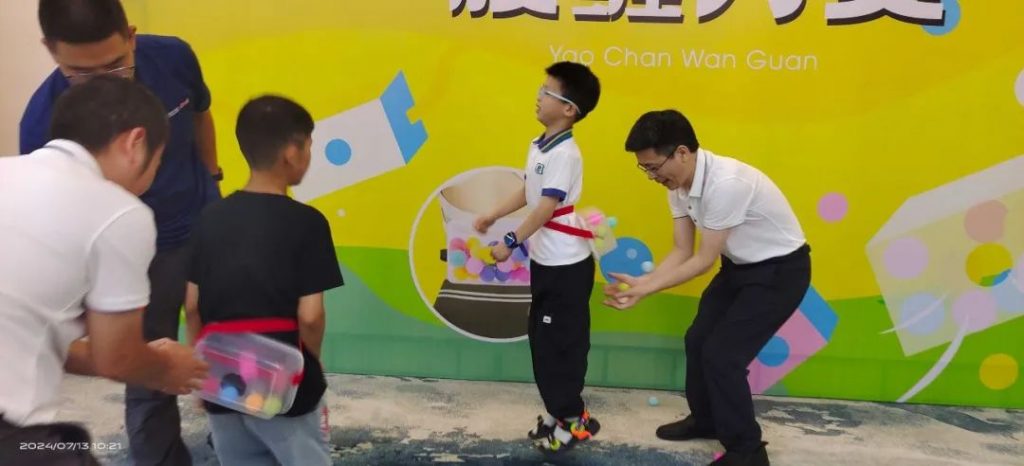 游戲規則:每組家庭10次投球機會,進球5個以上并不在同一個球桶內即為挑戰成功。