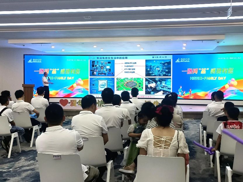 隨后,華宇電子研發部高級經理王釗向家人們作半導體知識科普,為了讓孩子更加清晰了解什么是半導體,王經理以身邊常用的電子設備為例,勾起了孩子們的興趣。他們認真聆聽,時不時與家長互動溝通,一片幸福祥和景象。